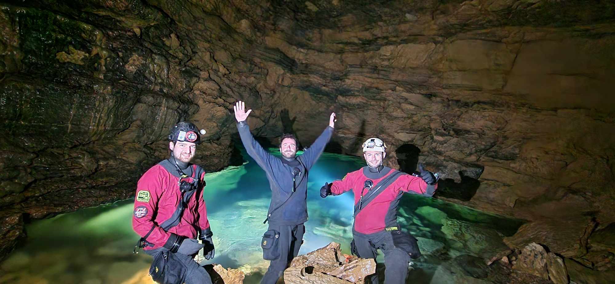 Au bout de près de 2400m, nous émergeons dans la salle du bivouac. Nous nous y déséquipons et occupons le temps en faisant quelques photos. Ces 50 minutes passées en surface sont précieuses: elle nous permettent de dé-saturer un maximum pour limiter les paliers de décompression qui seront nécessaires au retour.