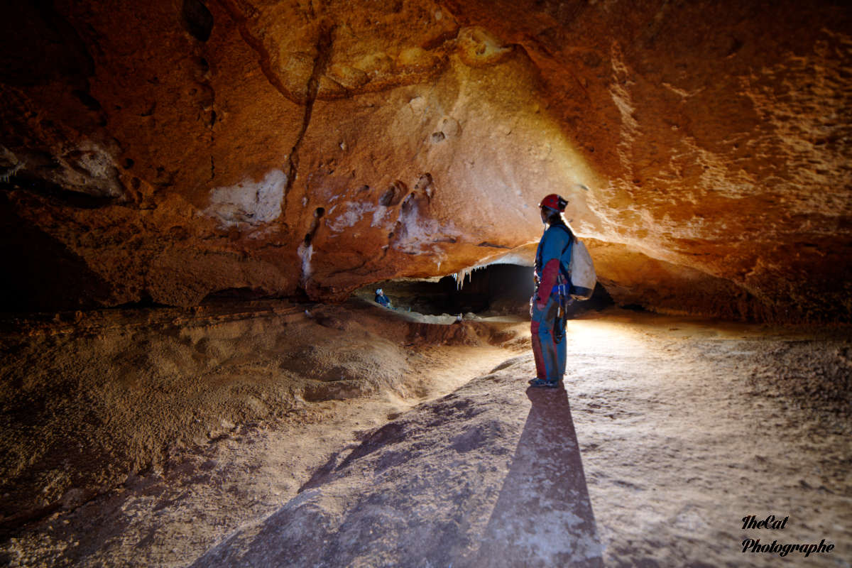 Nous prenons la galerie sur notre gauche, la progression est entrecoupée d’imposants gours. Après un premier ressaut de quelques mètres, nous arrivons au méandre de la chauve souris: un squelette de chauve souris calcifié se trouve à quelques dizaines de mètres du début du méandre.